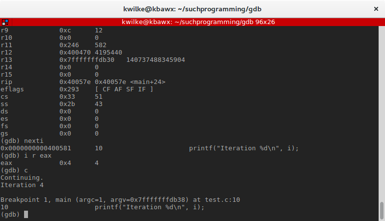 In the next post I’ll continue digging into this program and discover more about the disassembled version of my C program and show off some more GDB commands along the way!