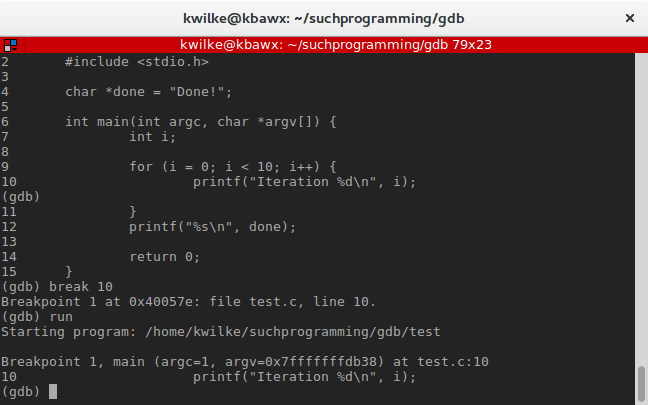 Looking at this listing, I think a good place to pause and look around would be at the printf() call within my for loop. To have GDB stop here I’ll use the break command and I’ll give it the argument 10 to indicate I’d like to set a breakpoint at line 10.